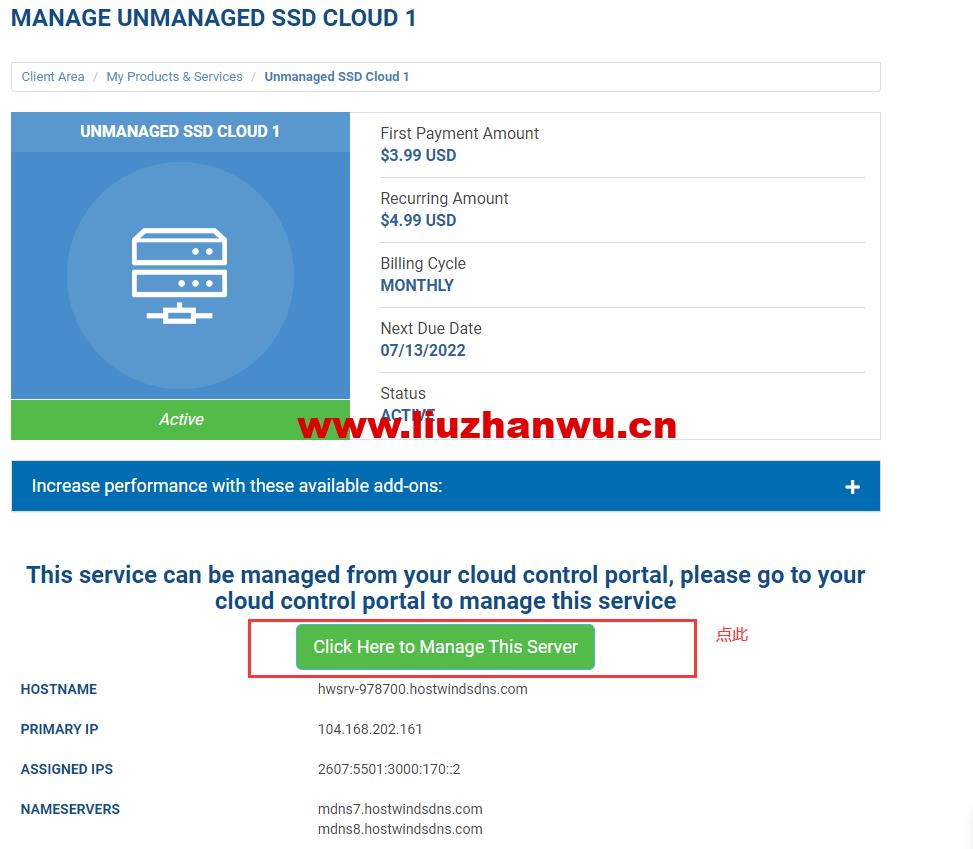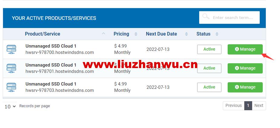 登录之后,可以看到我们已经购买的 VPS ,点击想更换 IP 的 VPS 后面的 Manage 按钮,如图所示: