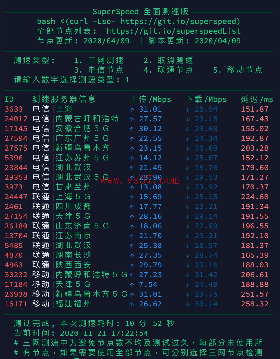 -> CPU Performance Test (Fast Mode, 1-Pass @ 5sec) 1 Thread Test: 231 Scores -> Memory Performance Test (Fast Mode, 1-Pass @ 5sec) 1 Thread - Read Test : 4839.64 MB/s 1 Thread - Write Test: 3406.89 MB/s -> Disk Speed Test (4K Block/1M Block, Direct Mode) Test Name Write Speed Read Speed 100MB-4K Block 234 kB/s (57 IOPS, 447.92s) 16.5 MB/s (4026 IOPS, 6.36s) 1GB-1M Block 59.0 MB/s (56 IOPS, 17.78s) 395 MB/s (376 IOPS, 2.66s) -> Speedtest.net Network Speed Test Node Name Upload Speed Download Speed Ping Latency Server Name Speedtest Default 1.91 MB/s 3.53 MB/s 149.74 ms China Telecom JiangSu 5G (China Suzhou) China, Beijing CU Fail: Timeout Exceeded after 60 seconds China, Shanghai CT 2.89 MB/s 2.90 MB/s 151.72 ms China Telecom (China Shanghai) China, Hangzhou CM 3.63 MB/s 3.52 MB/s 178.40 ms China Mobile Group Zhejiang Co.,Ltd (China Hangzhou)0