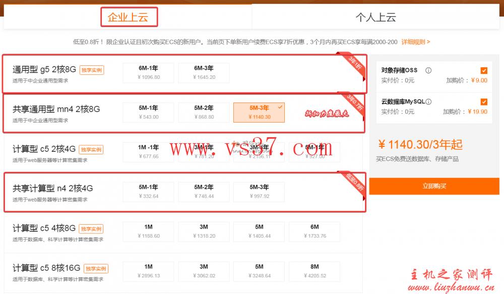 阿里云上云必备活动相比之前在方案介绍形式上还是值得肯定的,毕竟比较直观了,不像以前的促销活动,看着头疼。阿里云适合企业使用的云服务器需要企业认证新用户参与。大家可以根据自己业务需要重点关注1折、0.7折、0.8折的促销方案。同时购买云服务器还可以以超低价格加购“对象存储、云数据库”等。主机之家测评比较建议的便宜云服务器是“共享通用型 mn4 2核8G”5M带宽配备,3年给0.7折优惠、1140元就能拥有2核8G5M带宽的云服务器三年。