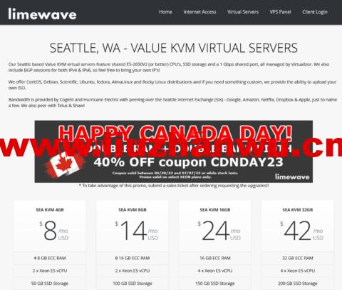 Limewave:西雅图机房vps,1核/2GB内存/20GB/5TB流量/1Gbps带宽,$2.7/月 Limewave发布了Canada Day促销活动,针对VPS主机提供6折优惠码,优惠后最低2GB内存套餐月付仅2.7美元起。除了本次的优惠码外,商家在LET论坛还搞了一个双倍内存和双倍流量的活动,要求在论坛帖子下回复,有兴趣的可以去看看: Limewave怎么样,Limewave是一家2010年注...