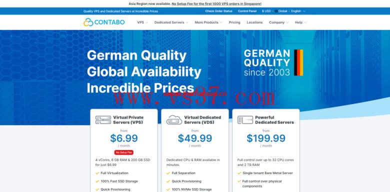 Contabo:美国、德国、新加坡等机房可选,4核8G高性价比VPS,200M-1Gbps不限流量,月付6.99美元起 Contabo怎么样,Contabo好不好,Contabo基本上不会有任何优惠,就算特别重大的日子,也最多免除设置费用,所以真想购买它家的产品,也不用等什么节日活动,年付是没有设置费用的。但是它家的产品性价比是真的高,而且现在数据中心也分布很广,有需求的朋友可以关注一下。 官网:https://co...